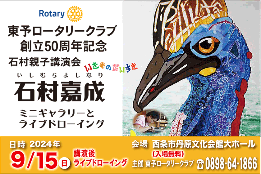 HOME NEWS 新着情報 東予ロータリークラブの新着情報 2025/10/02 例会情報 更新UPしました。2025/04/21 週報 更新UPしました。2025/01/03 週報 例会情報 クラブ概要更新UPしました。 <↓『石村親子講演会』につきましては、お陰様で大盛況に終わりました。ありがとうございました。↓>2024/09/15 東予ロータリークラブ創立50周年記念イベントが開催されました。 東予ロータリークラブの新着情報は、Facebookページをご参考下さい。 CONCEPT 2024-2025年度 東予ロータリークラブテーマ「ロータリーの文化を育み、楽しみましょう!」 会長 渡部 英志 Roatary International 2024-2025 R.I. 会長 ステファニーA.アーチック MORE ごあいさつ クラブ概要 例会情報 週報一覧 会員名簿 例会場 LINK